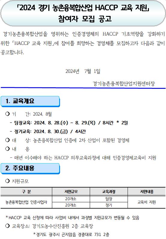 2024년 경기농촌융복합산업 HACCP 교육 참가자 모집