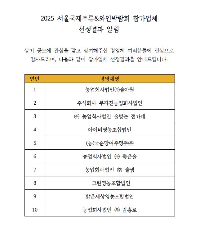 2025 서울국제주류&와인박람회 참가업체 선정결과 알림