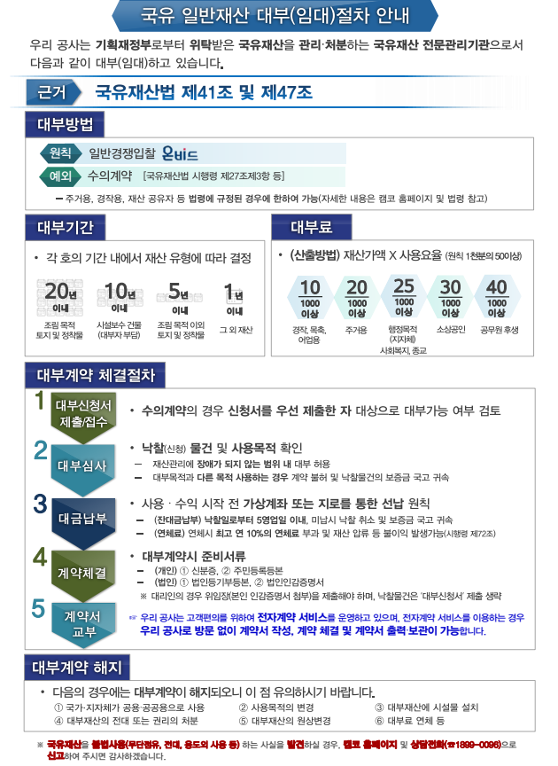 3. 절차: e나라재산(k-pis.go.kr) 정보마당 국유재산일반현황 필요한 국유부동산정보(시,군,면,리) 검색 -> 해당 국유재산의 상세정보에서 관리기관 및 연락처 확인 -> 담당자 상담 -> 현장 확인 -> 무상대부(임대)신청 -> 사용가능여부 심사 ->